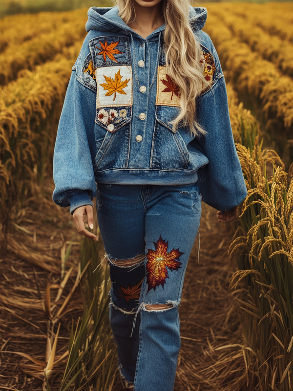 Autumn Fashion Maple Leaf Embroidery Denim Sweatshirt + Pants Set c6e5