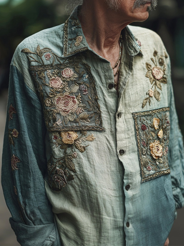 Boho Vintage Floral Patchwork Art Men's Linen Long Sleeve Shirt cebd