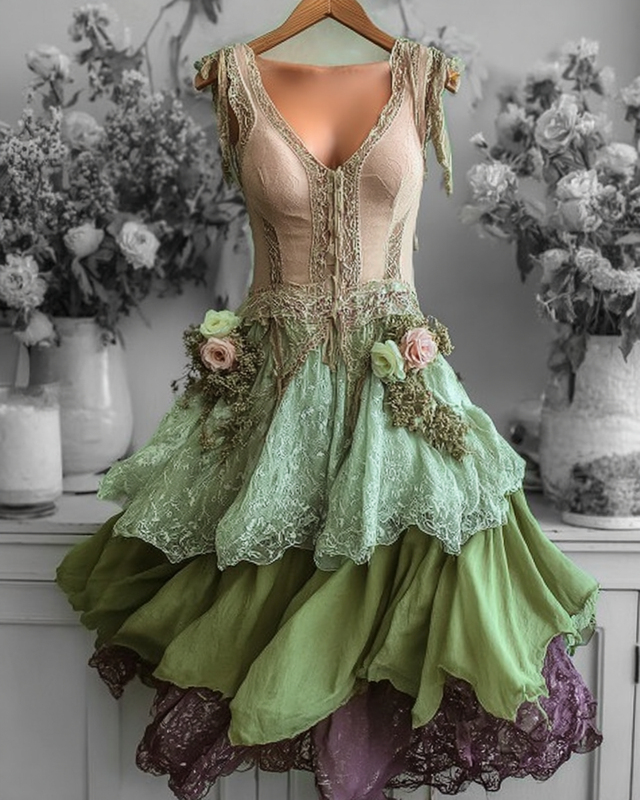 Elegant Green and Purple Lace Dress 0ae3