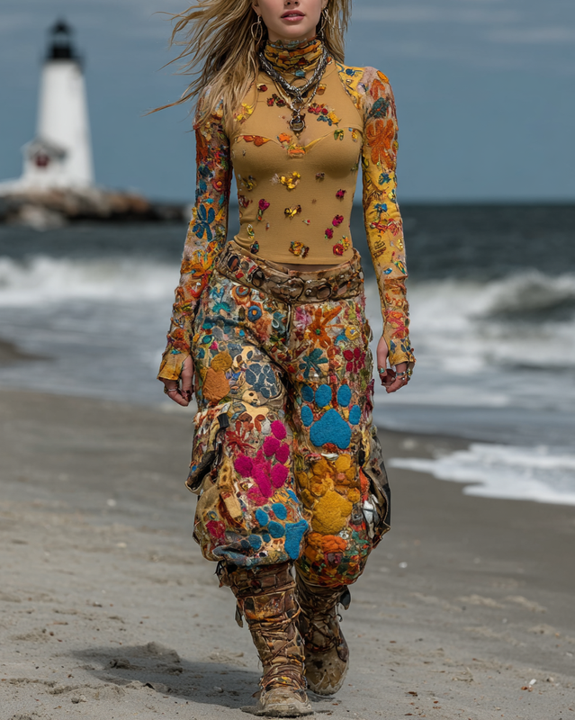 Elegant Seaside Top and Pants Dog Paw Print Two-Piece Set 0255