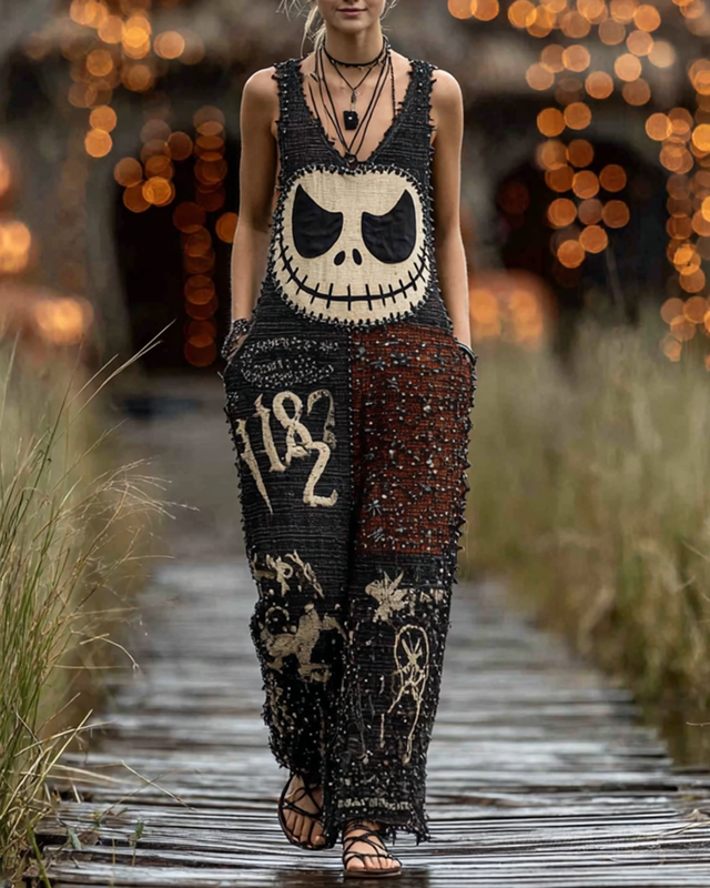 Halloween Themed Contrast Color Rhinestone Linen Jumpsuit 0166