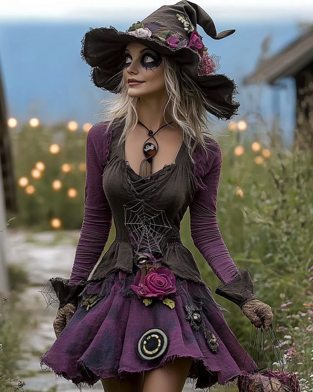 Halloween Themed Contrasting Color Patchwork Ruffle Witch Dress da97