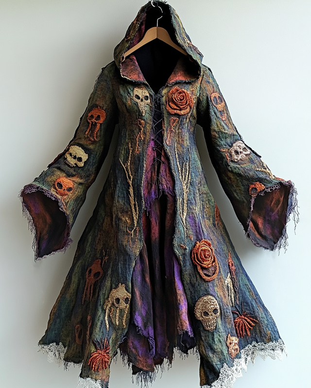 Halloween Themed Skull Rose Embroidered Gradient Lace Patchwork Hooded Cape 2fd8
