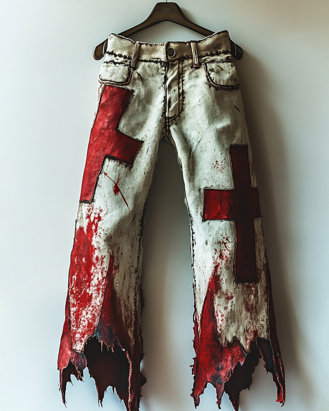 Halloween Themed Irregular Contrast Cross Embroidered Linen Trousers 28db