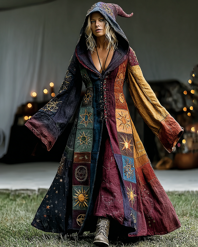 Halloween Themed Star And Moon Embroidery Patchwork Hooded Witch Dress 34d2
