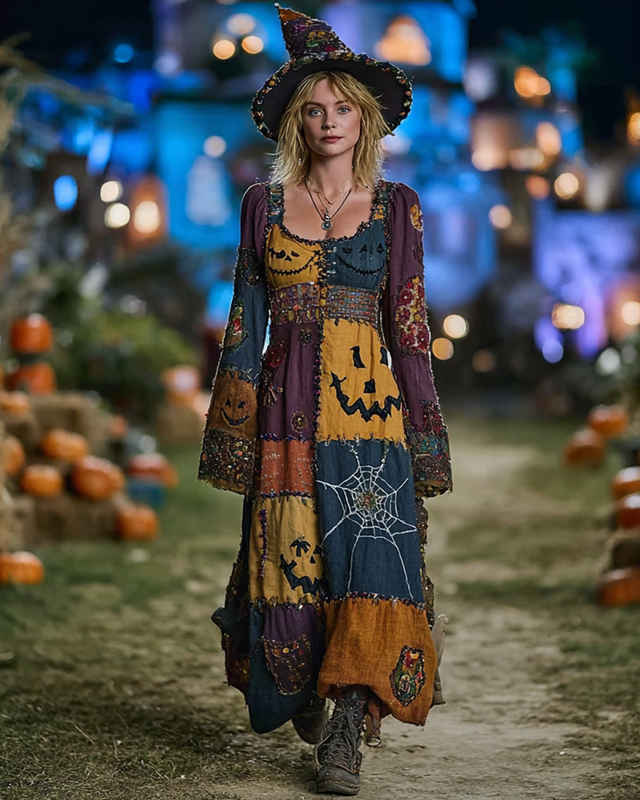 Halloween Themed Embroidery Contrast Patchwork Dress 21f3