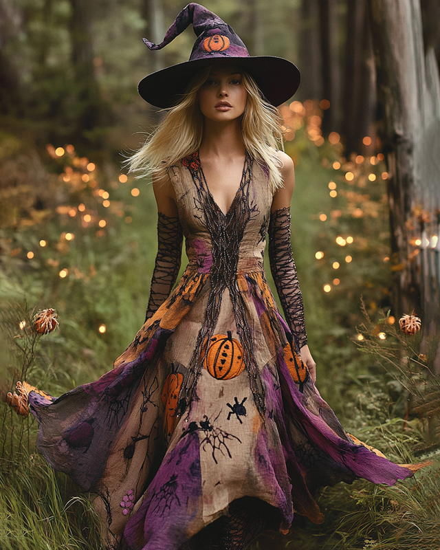 Halloween Themed Tie-dye Ombre Pumpkin Spider Embroidered Beaded Witch Dress f9d5