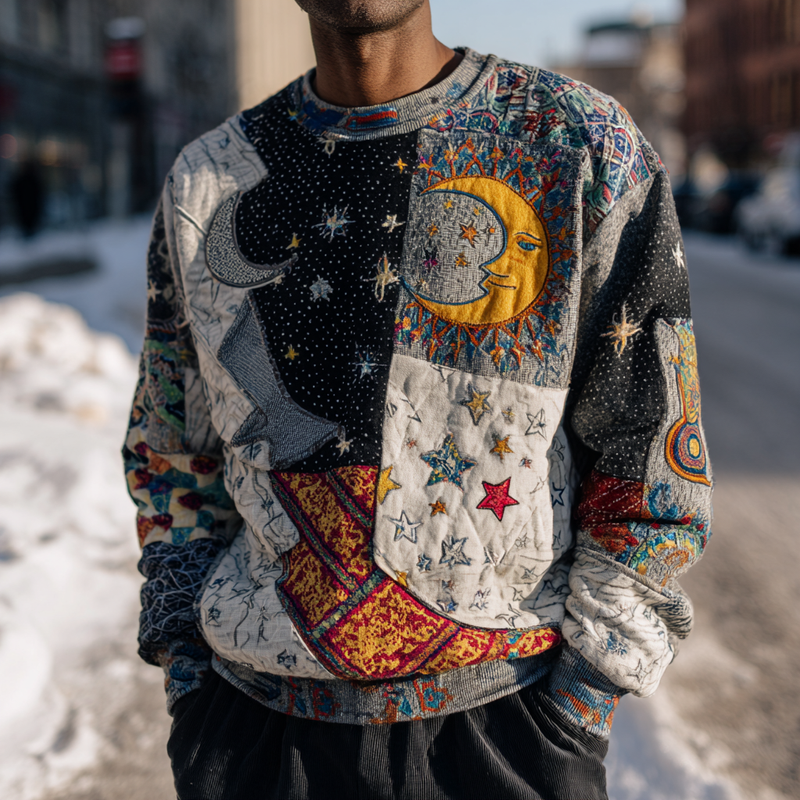 Men's autumn and winter contrast color stitching star and moon embroidered top 30fa