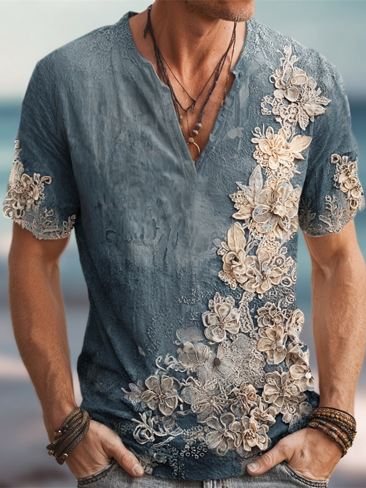 Men's Bohemian Floral Embroidered V-neck Shirt 6378