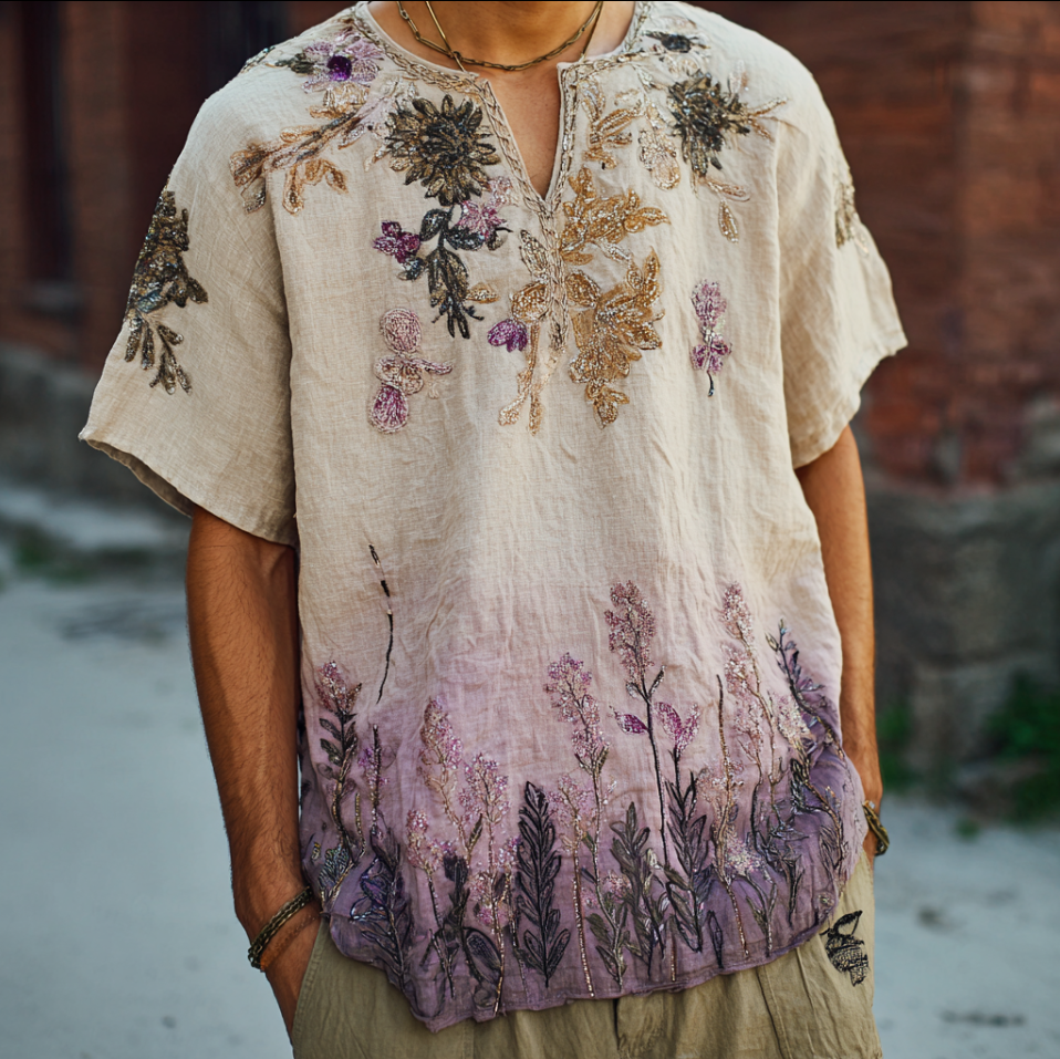 Men's Bohemian Style Purple Gradient Flower And Grass Embroidery Pattern Retro Cotton And Linen Short-sleeve Shirt 872a