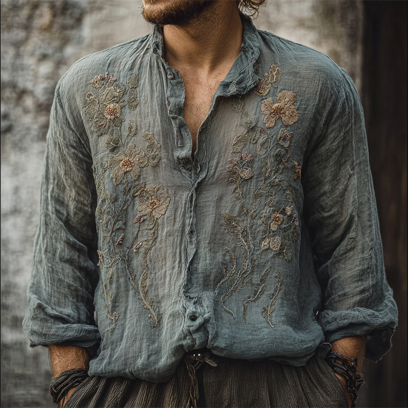 Men's Boho Floral Embroidered Flowy Beach Linen Shirt 0689