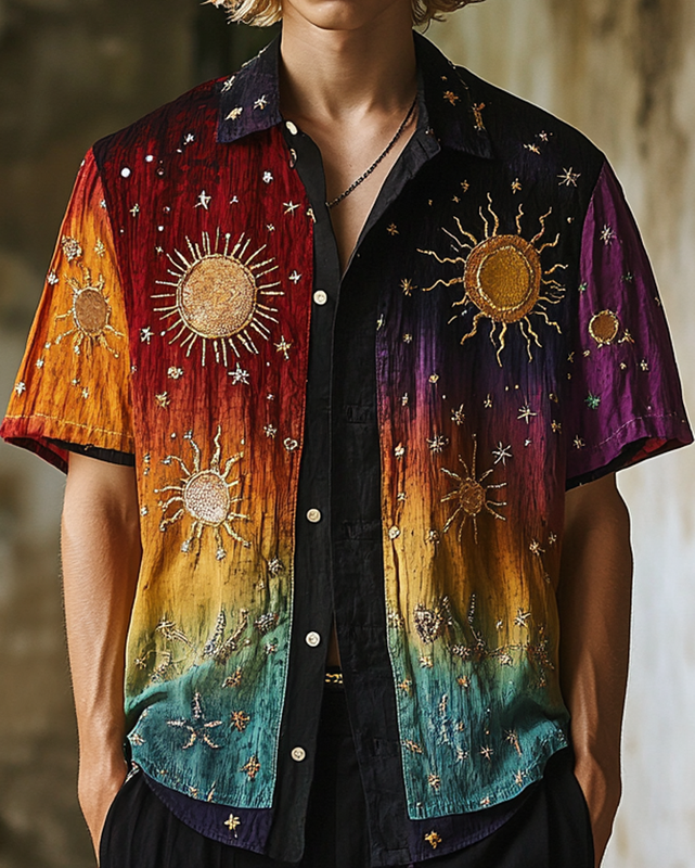 Men's Summer Vacation Star and Moon Embroidery Rainbow Tie-Dye Short Sleeve Shirt 3d84