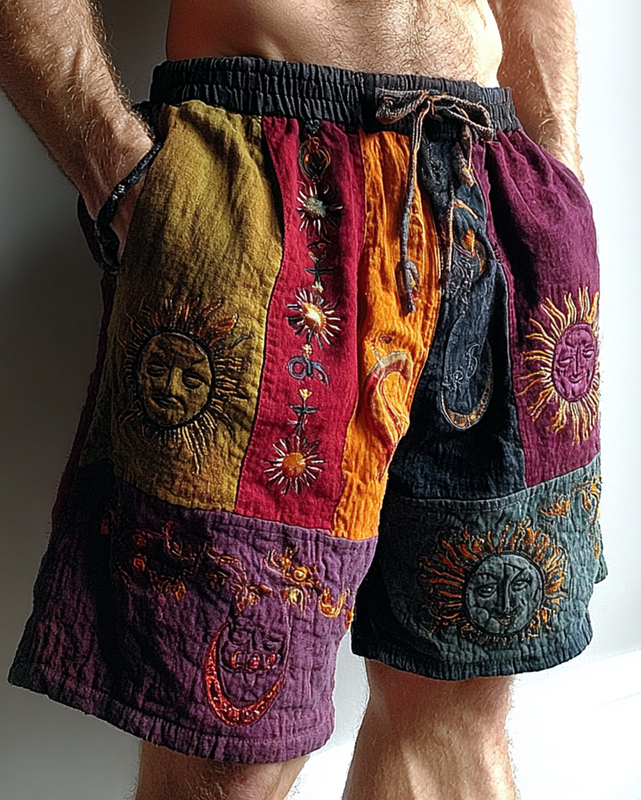 Men's star and moon embroidered contrast color stitching shorts 3982