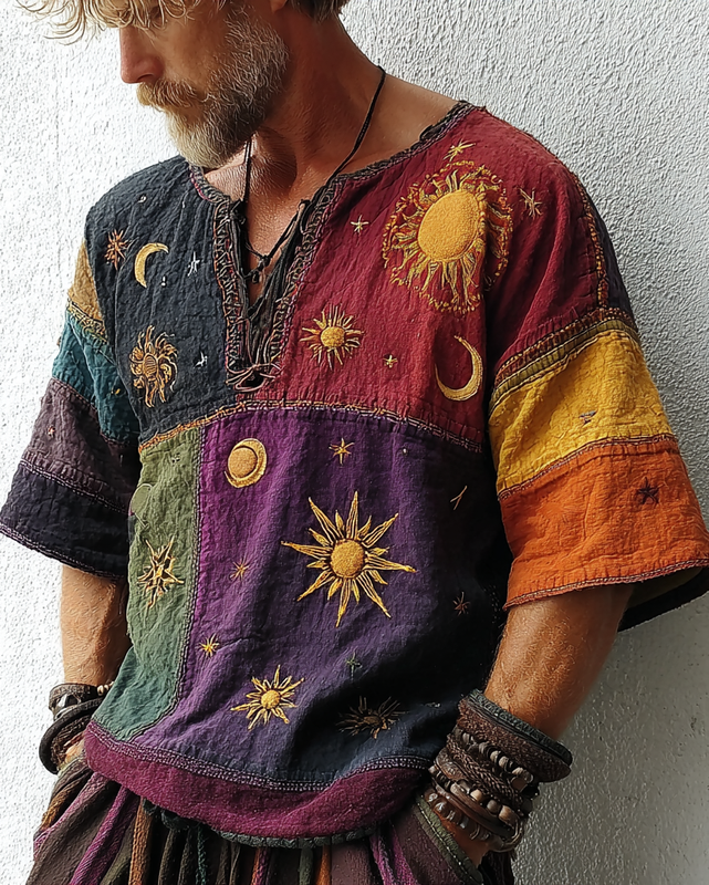 Men's star and moon embroidered contrast color stitching short-sleeved top 68f5