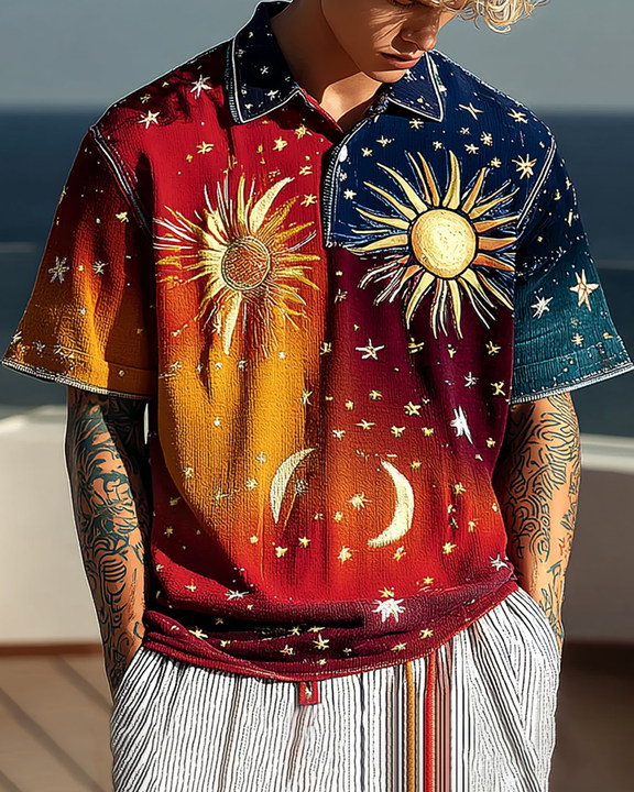 Men's summer vacation star and moon embroidered tie-dye polo shirt 0214