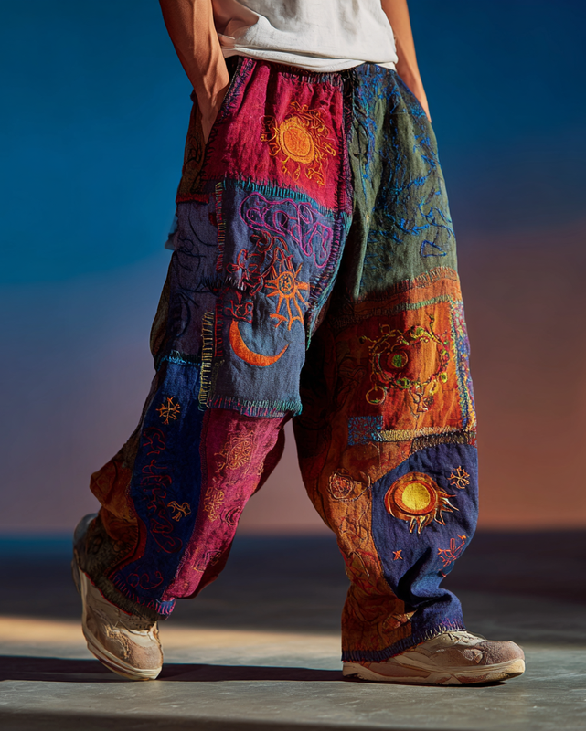 Men's Summer Vacation Star and Moon Embroidery Linen Pants 11a4