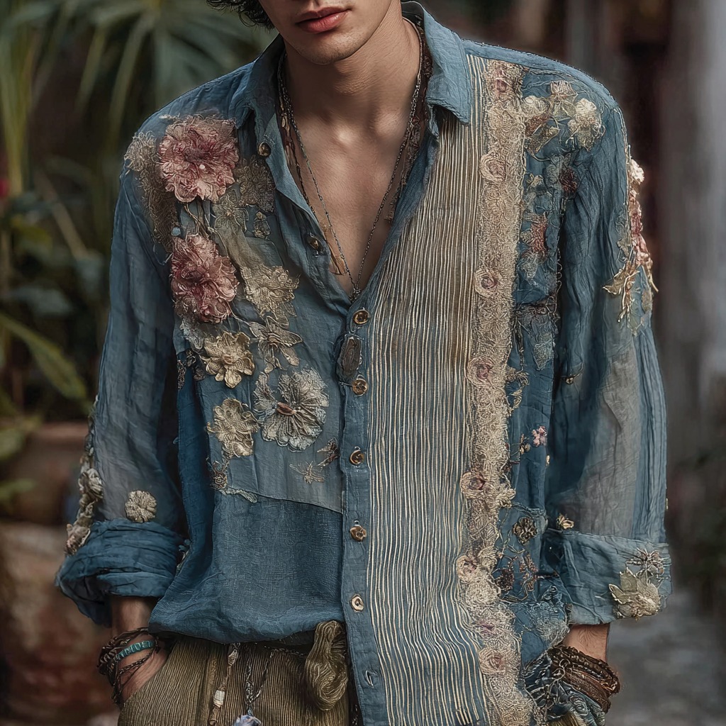 Men's Vintage Bohemian Floral And Stripe Embroidered Linen Shirt 1ab4
