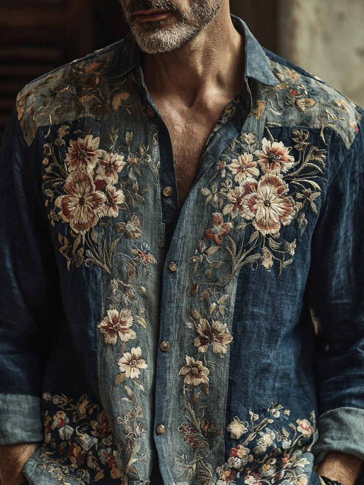 Men's Vintage Flowers Embroidered Contrast Linen Blouse 3df8