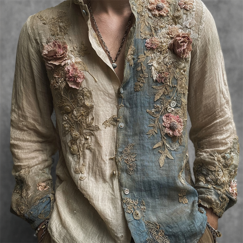 Men's Vintage Flowers Fiber Art Embroidered Contrast Linen Shirt 07d1