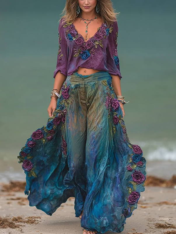 Seaside lace embroidered retro top + pants set 3a85