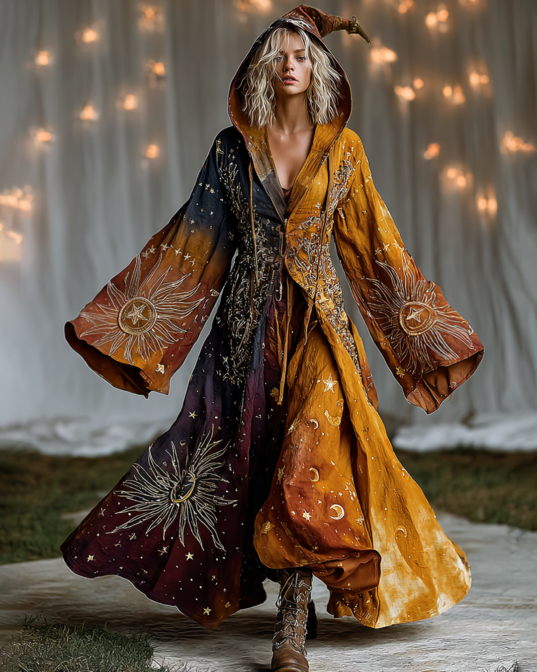 Star And Moon Themed Embroidery Contrast Color Hooded Witch Dress b70d