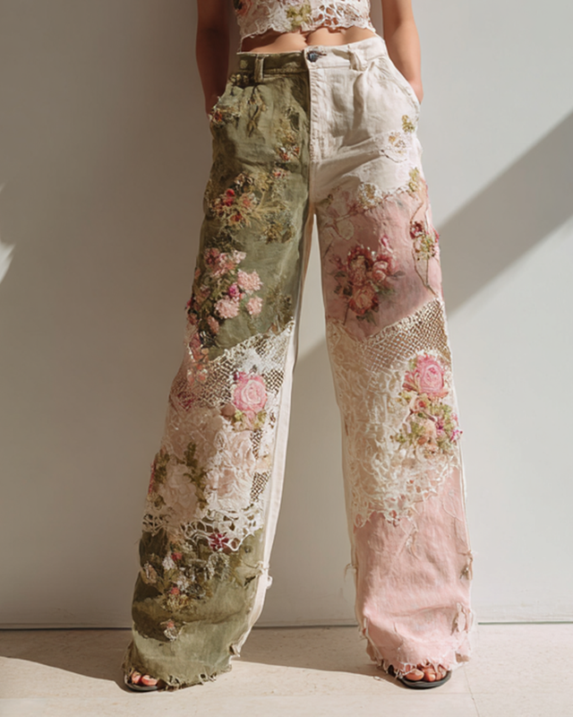 Summer Holiday Floral Embroidery Contrast Color Patchwork Pants a569