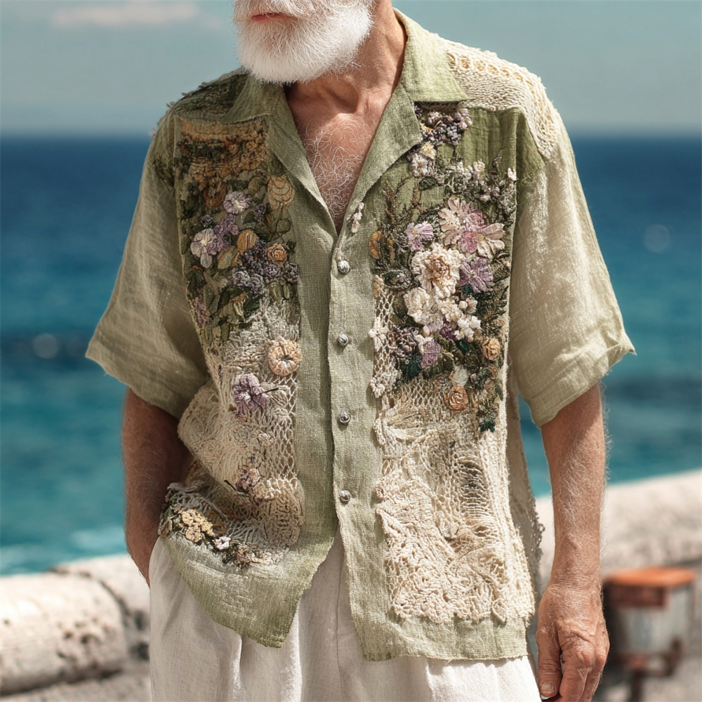 Vintage Boho Lace Floral Art Men's Linen Short Sleeve Shirt fea7
