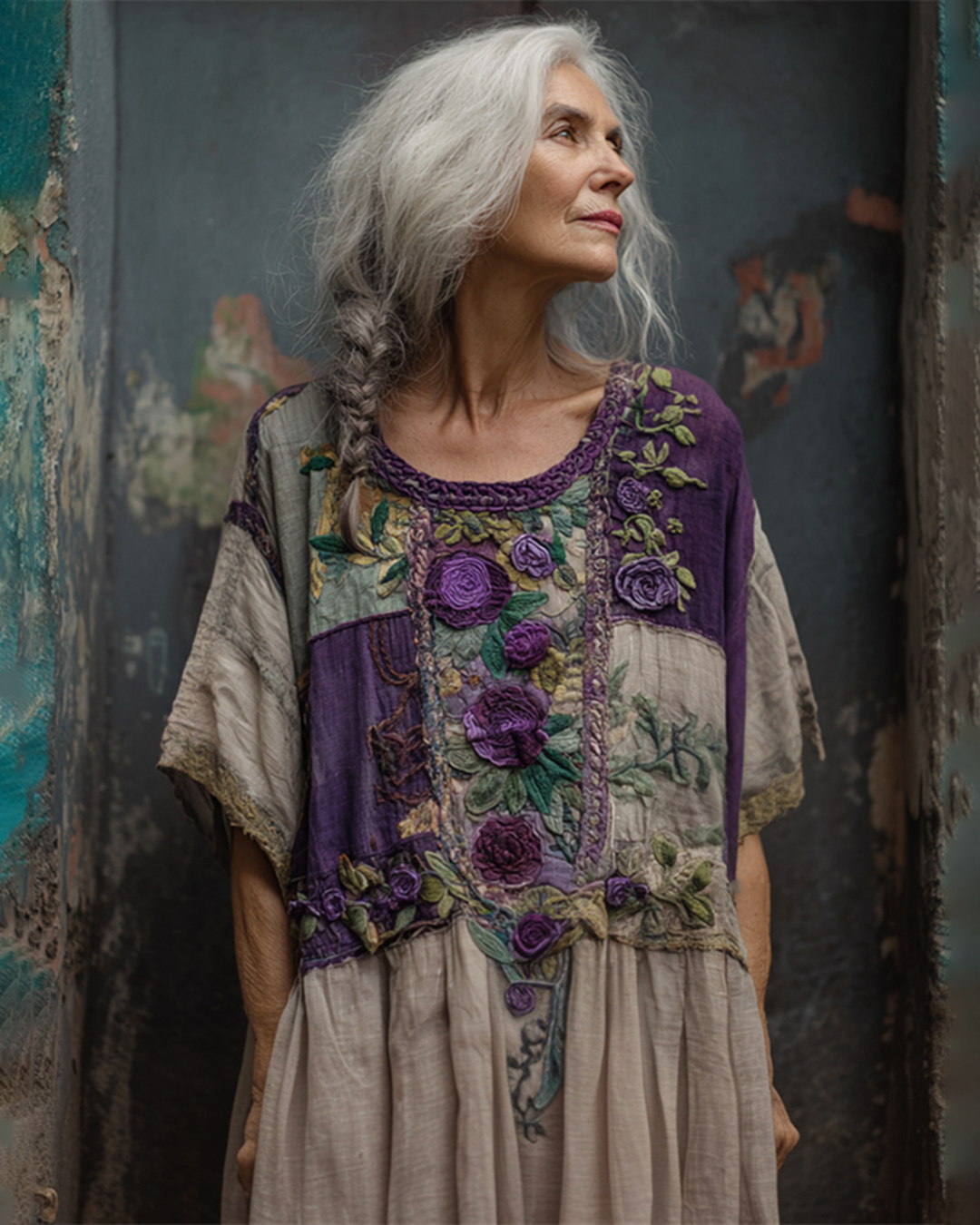 Vintage Cottagecore Purple Roses Embroidered Patchwork Linen Maxi Dress a790-