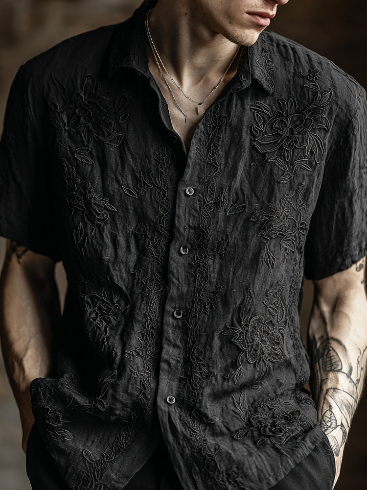 Vintage Floral Lace Embroidered Short Sleeve Linen Shirt 2c51
