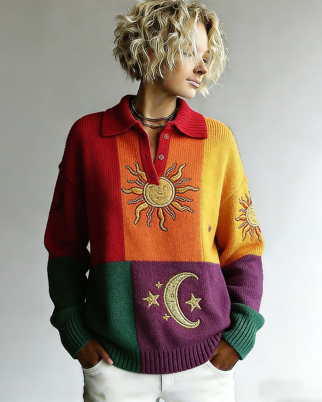 Women's Winter Fashion Star and Moon Embroidery Color Block Polo Shirt 1366