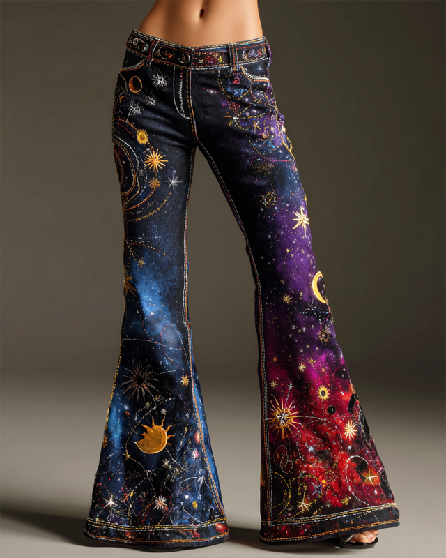 Women's autumn and winter star and moon embroidered contrast color stitching flared pants 424d