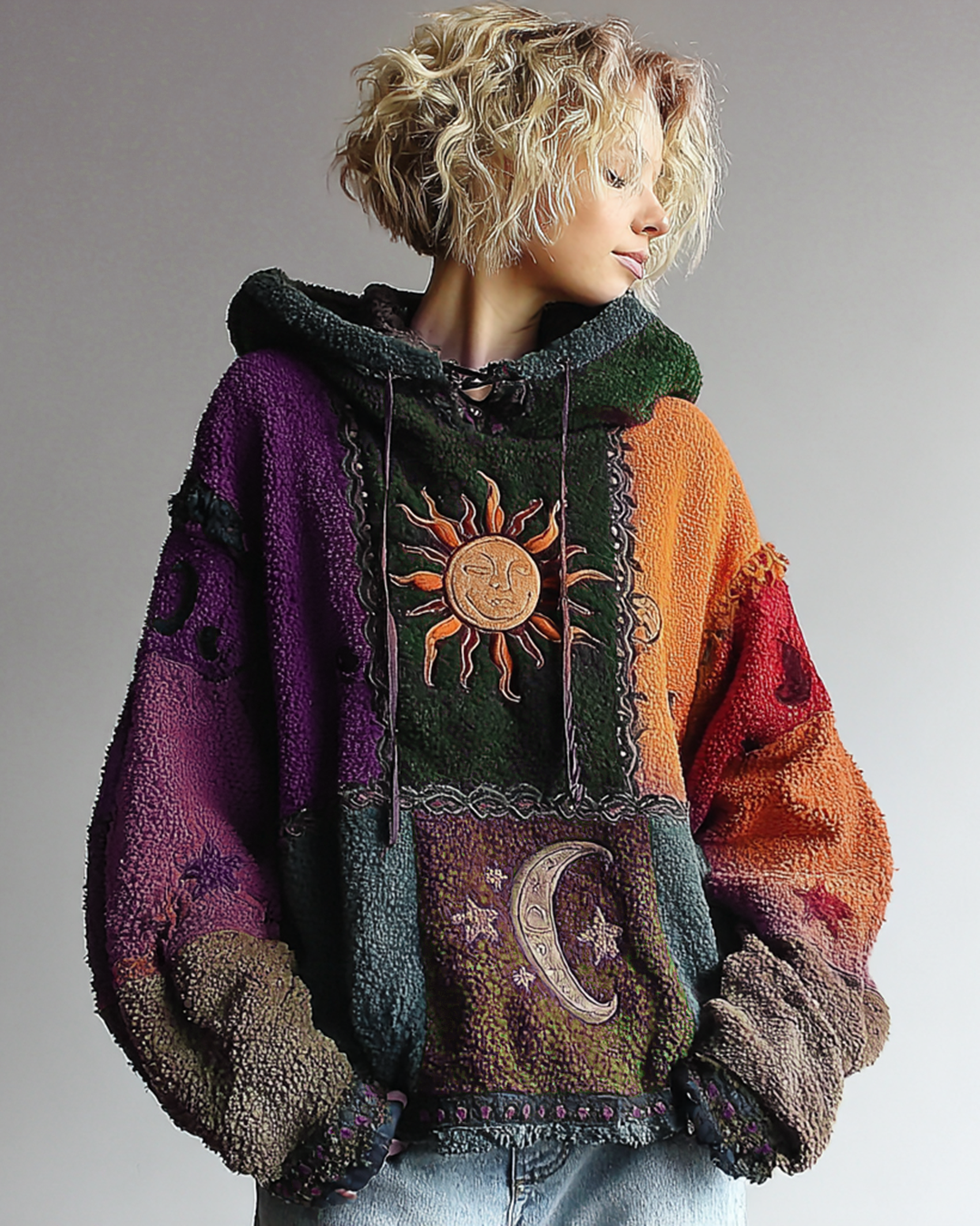 Women's Star and Moon 3D Embroidered Contrast Color Stitching Hooded Sweatshirt 8732