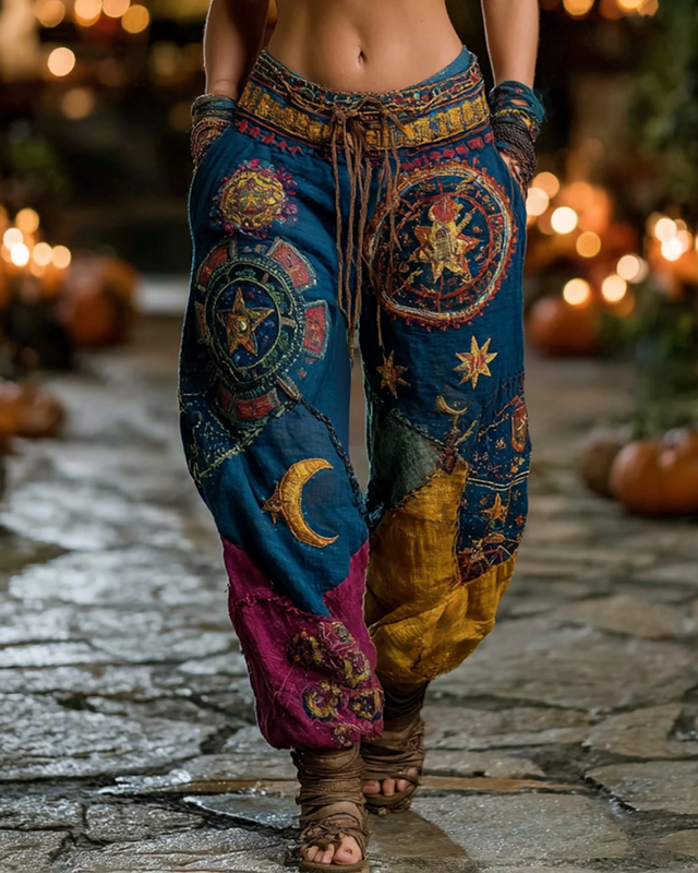 Women's Summer Star and Moon Theme Embroidered Contrast Color Linen Trousers 51b8