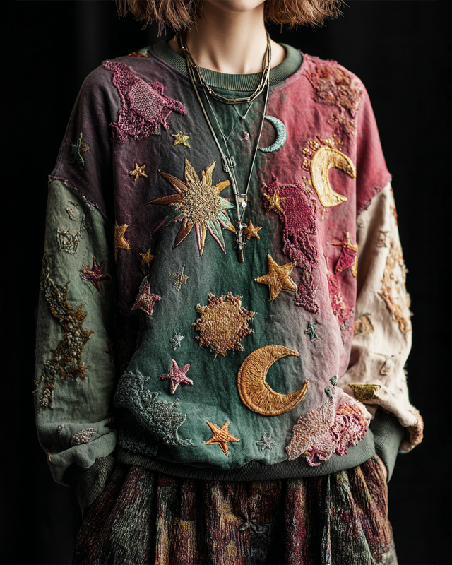 Women's Summer Vacation Floral Embroidered Linen Patchwork Long Sleeve Top c918